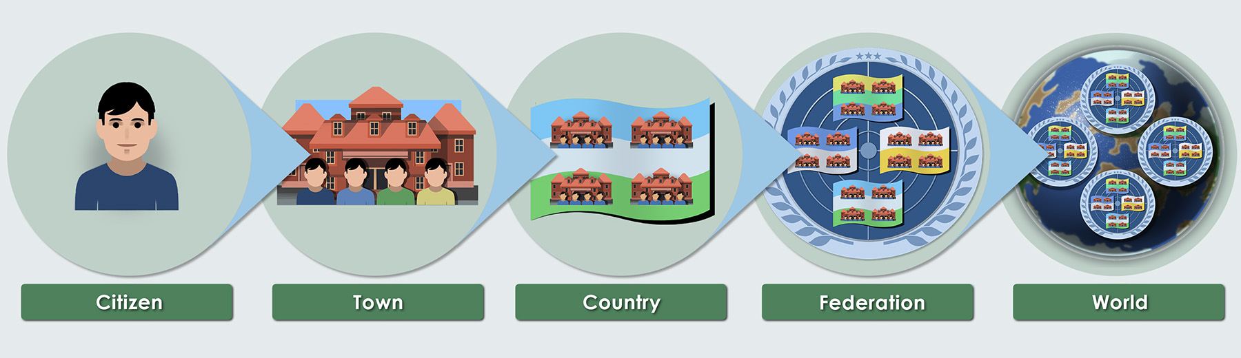A key factor in allowing scale in the creation of these institutions is making them exist as hierarchical layers, with repeated patterns at each layer. For example, small groups of Citizens can form a town, and then towns can band together to found a country, and countries can band together to found a federation.