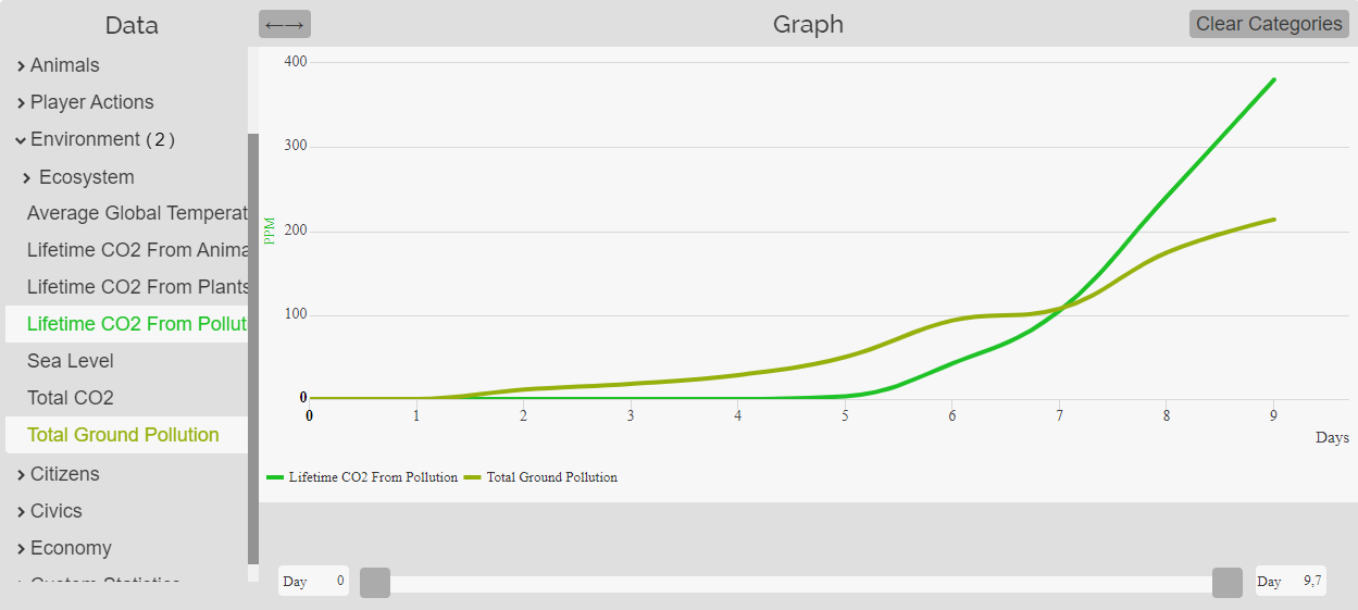 A graph in an Eco world showing the correlation between Citizen created pollution and CO2 in the atmosphere.