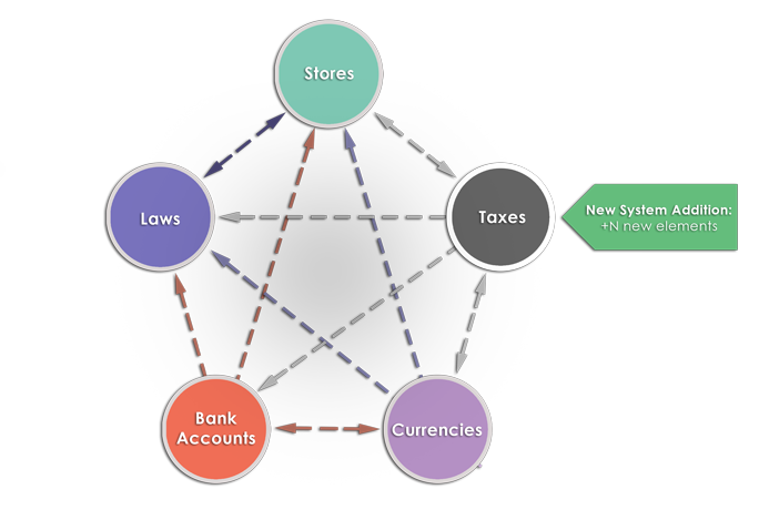 Designing these systems is easier than it might seem, because you get huge wins from their network effect. That is, when you add a new system (say, adding economics to an ecosystem simulation as in Eco) you instantly get a multiplying effect as that system affects and is affected by every other system. Adding an Nth system gives you N new interactions, with each other system that already exists. Contrast this to adding another piece of content: a level, an outfit, a skin. Instead of N new interactions, you get one.